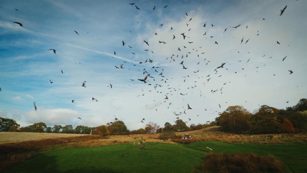 A red kite feeding centre on a small family-run farm in the heart of mid-Wales, where hundreds of birds come every day