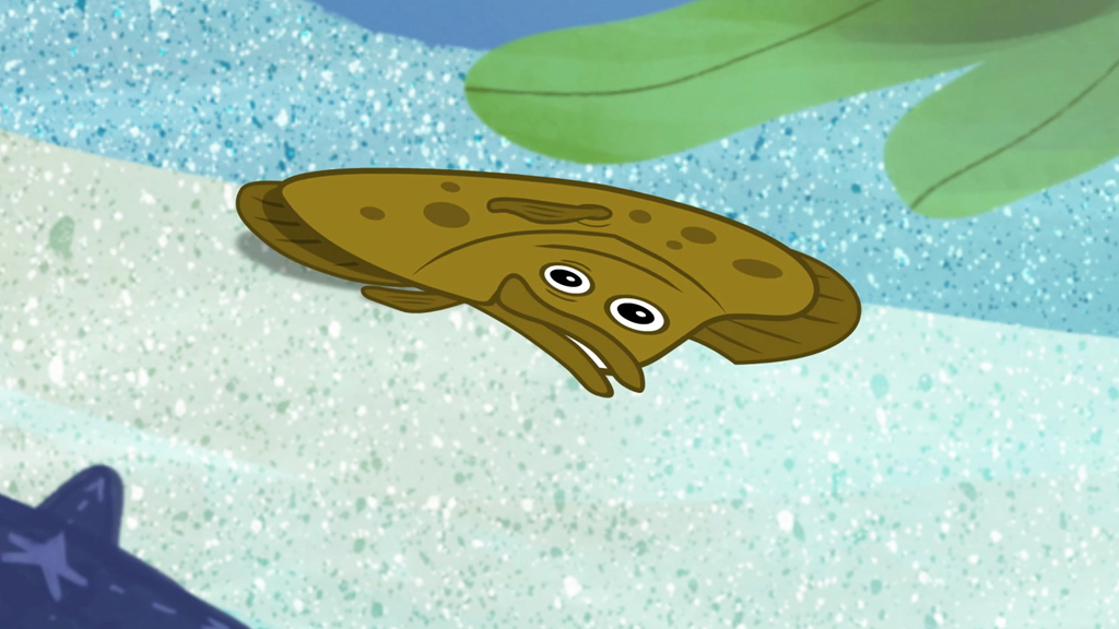 The California halibut talks about himself. He has two eyes on the same side of his head. This means that the can look up with both eyes, while he is lying down