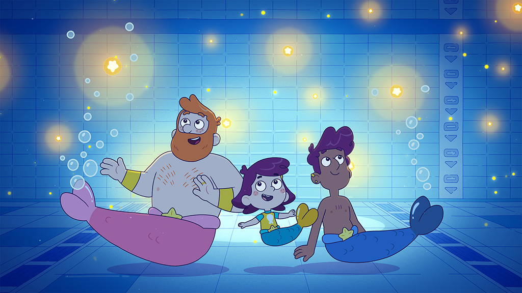 Rafi wants to swim with both her dads, but Jake feels nervous in the pool. Rafi makes a wish, and suddenly they all have mermaid tails