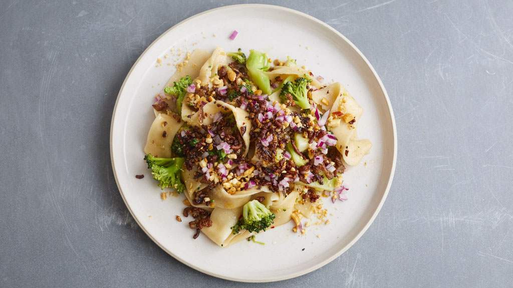 Jamie shares clever ways to make meat stretch further, preparing meatball kebabs on a bed of creamy lentils and rice, and crispy pork noodles with sticky ginger and garlic