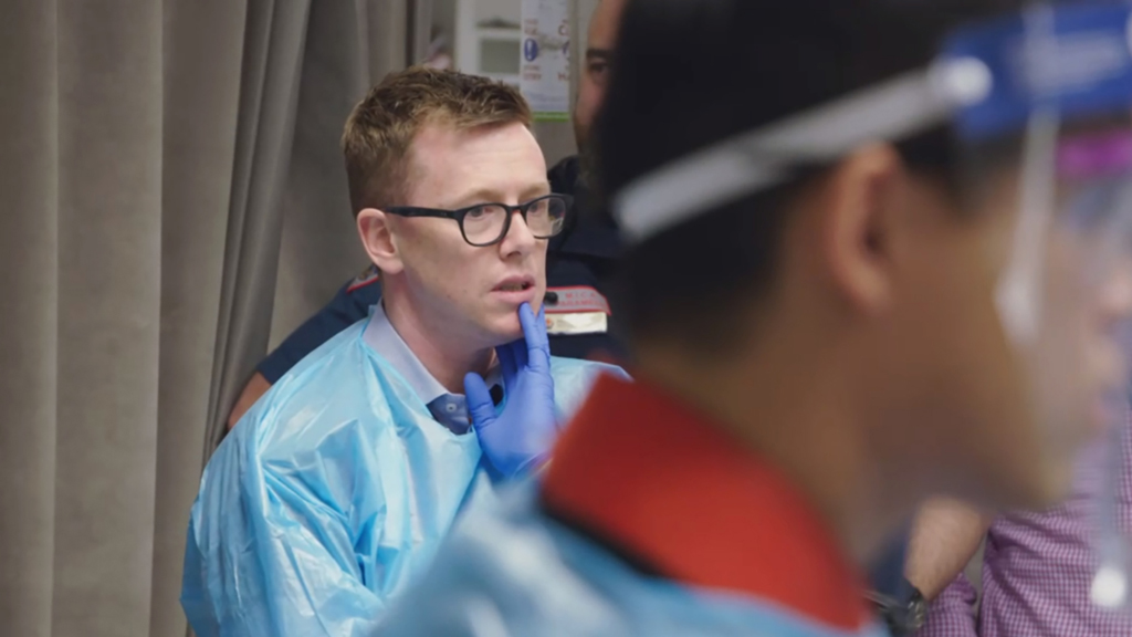 Dr Mark tries to help a car crash patient under police guard