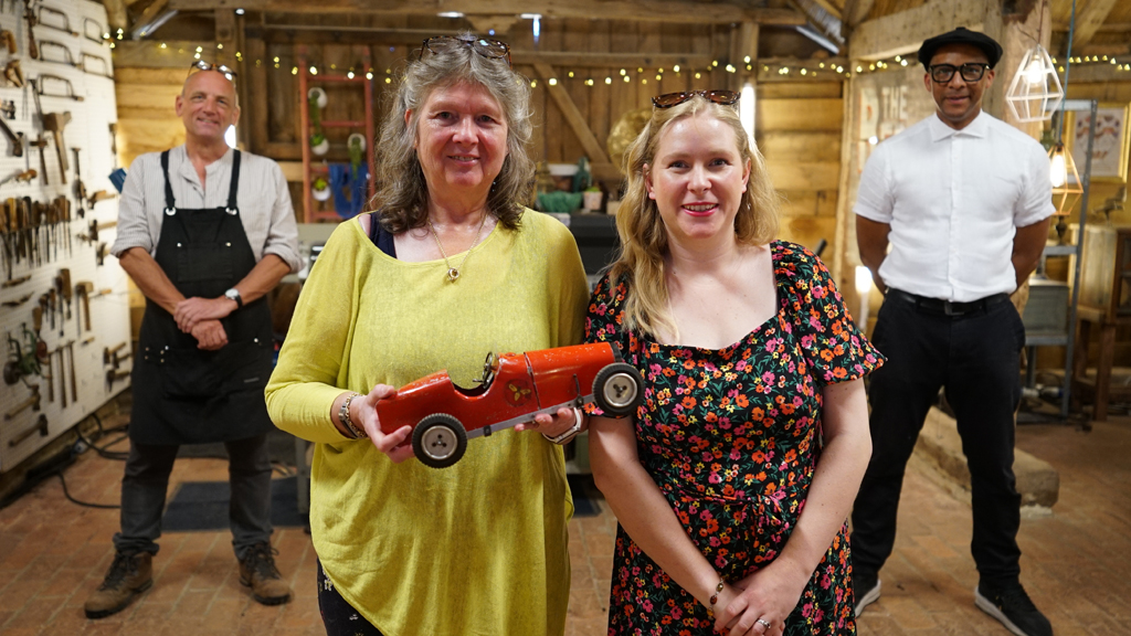 The experts repair a hand-made toy racing car, a leather bowls bag and a carved wooden box brought over from the Far East by a young bride in the 1950s