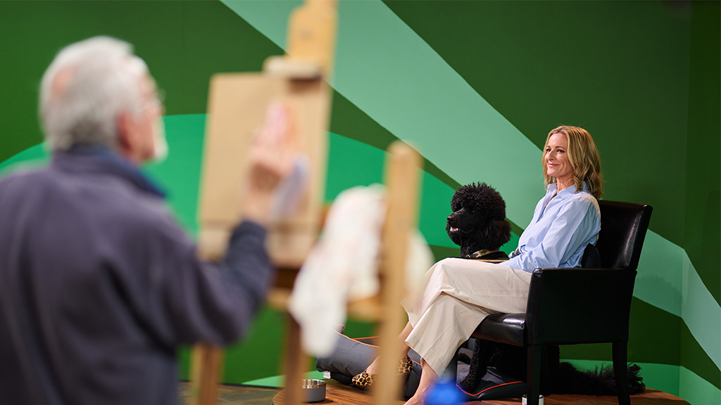 Stephen Mangan invites nine artists to paint celebrity sitters Shane Lynch, Gabby Logan and Beth Rigby as Tai Shan Schierenberg, Kathleen Soriano and Kate Bryan judge the efforts
