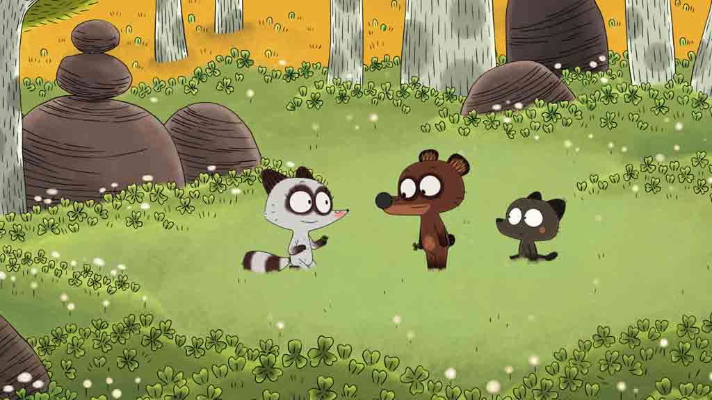 A monkey does some impressions, a pair of curious bears investigate a tree and a dog goes skateboarding