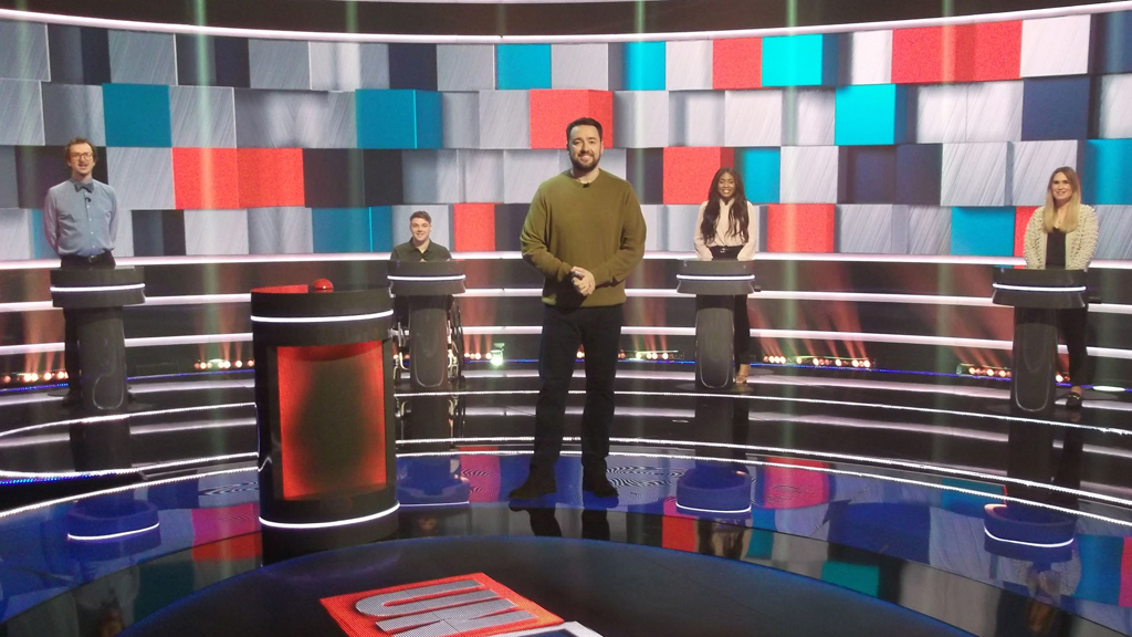 Roman Kemp and Sarah Greene host the quiz in which five contestants race in moving podiums across the studio floor to try and win £5,000