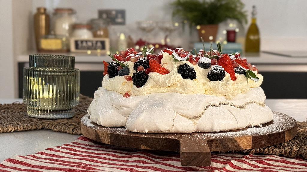 Christmas-themed cooking show, presented by Abigail Niclomhair. Here, Abigail makes an inspired Christmas-Pavlova wreath